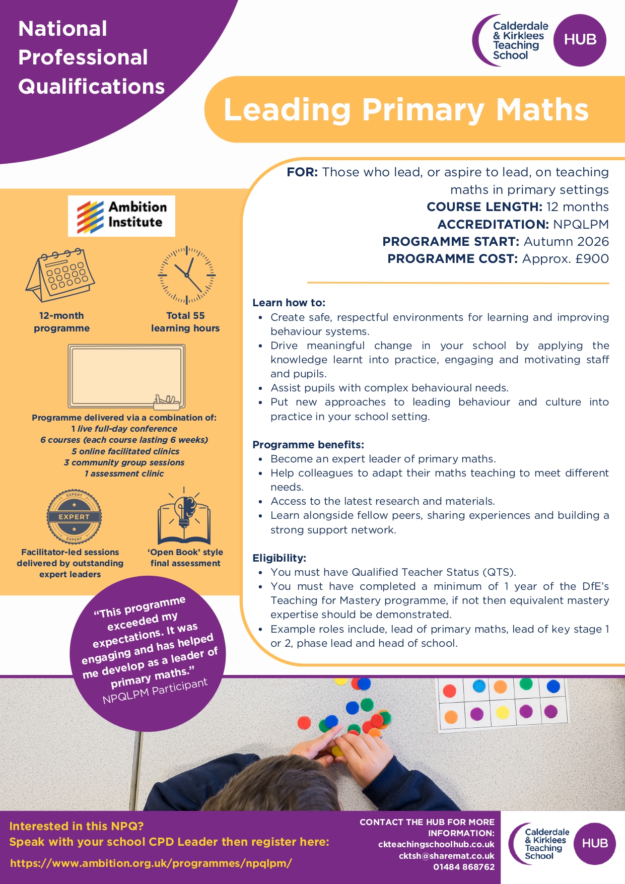 Participants on the NPQ Leading Primary Maths will develop their understanding of excellent mathematics teaching for mastery and the concepts that support successful leadership of mathematics. See the NPQLPM framework for further details.