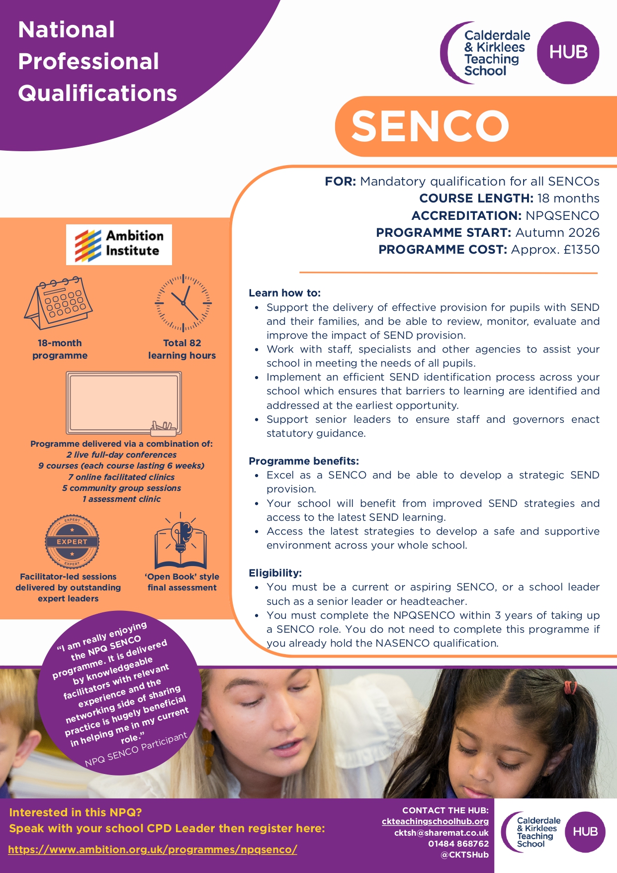 This new course designed for SENCOs replaces the NASENCO qualification. Participants will become expert leaders of special educational needs and will learn how to build an inclusive culture in their school where all pupils can succeed. Ambition Institute: What is the NPQ for SENCO?  See the NPQSENCO framework for further details.
