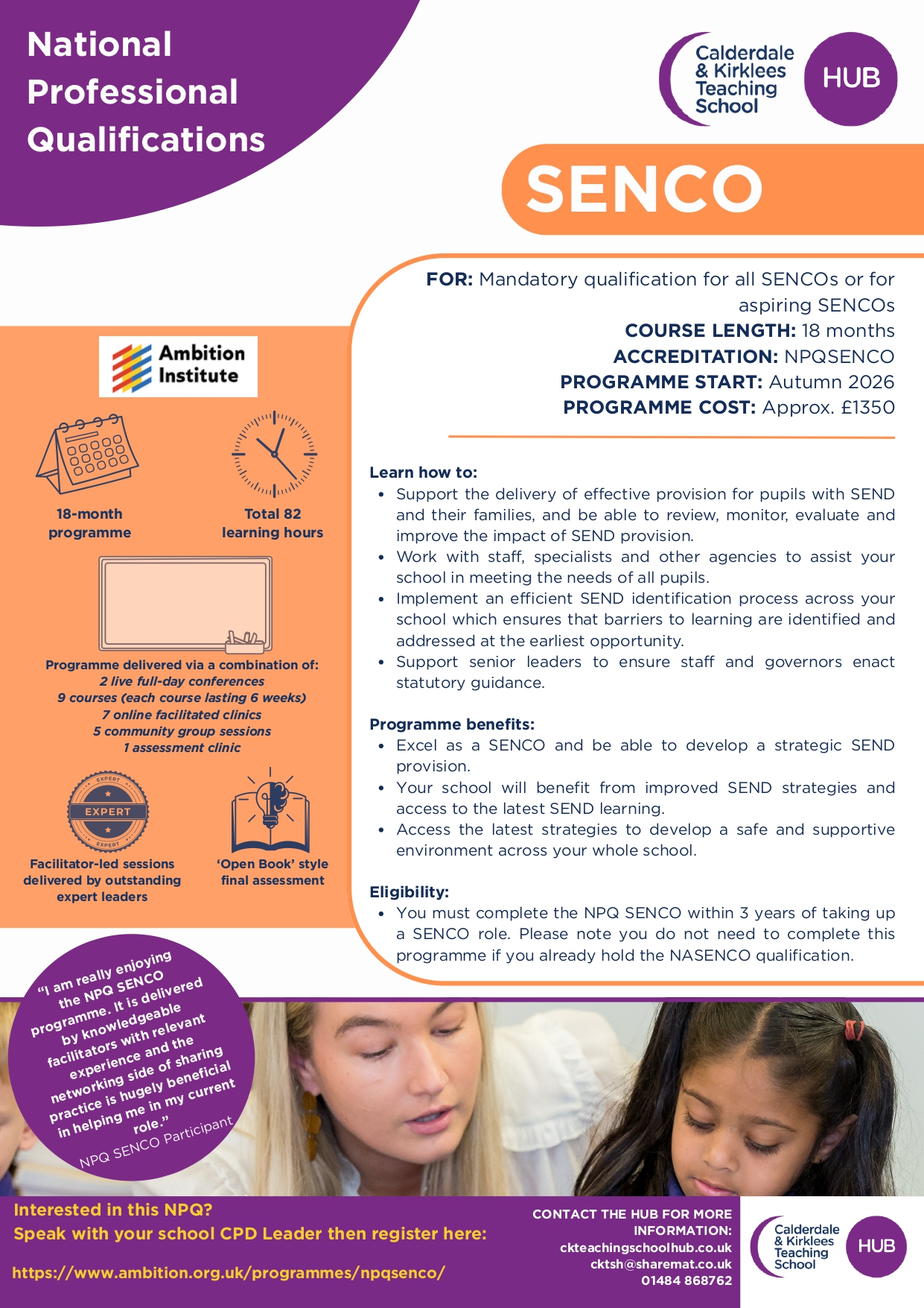 This new course designed for SENCOs replaces the NASENCO qualification. Participants will become expert leaders of special educational needs and will learn how to build an inclusive culture in their school where all pupils can succeed. Ambition Institute: What is the NPQ for SENCO? See the NPQSENCO framework for further details.