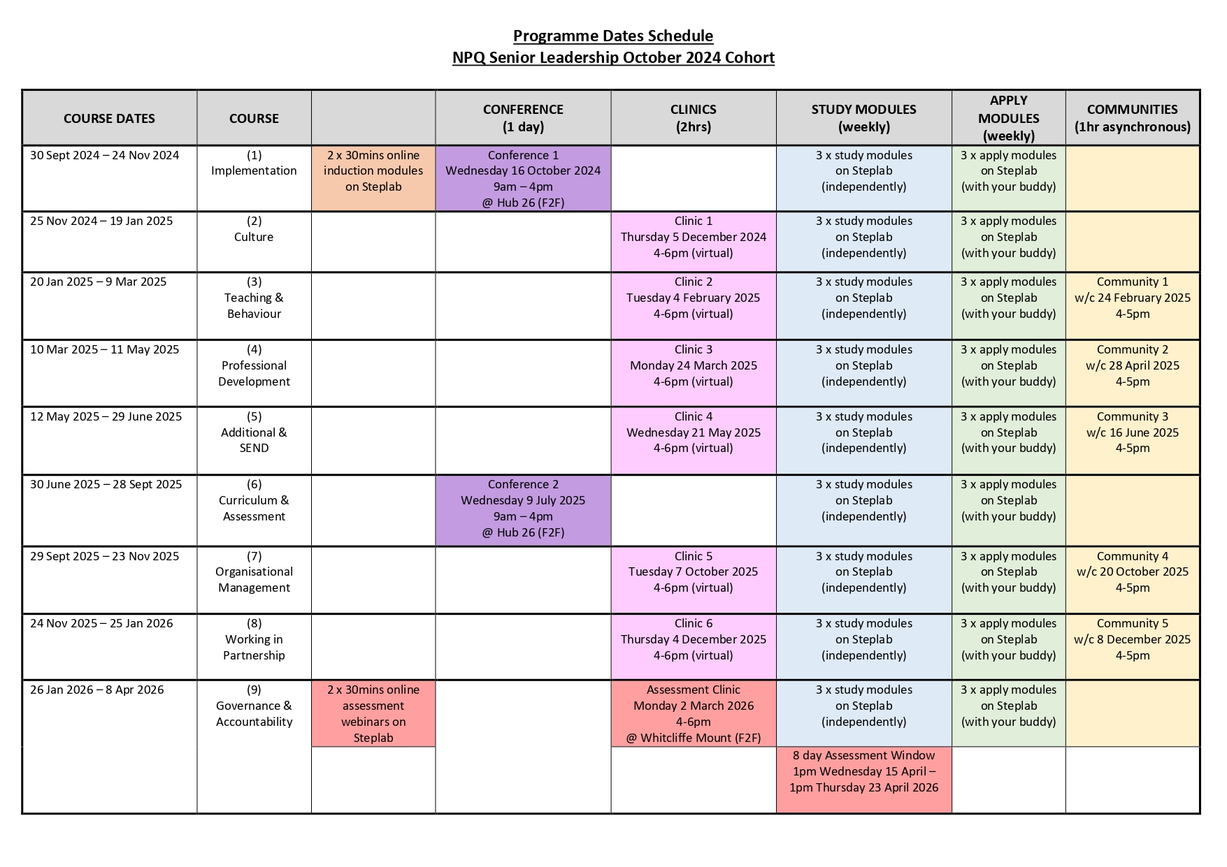 - Participant workbook: log in to your My Ambition to download a copy of the workbook from your Steplab. You will find it under 'library - NPQ - Participant Materials - NPQ Senior Leadership - NPQSL Oct 24 Key Programme Resources - 1: conferences, clinics and communities workbooks - start reading - assessment clinic'