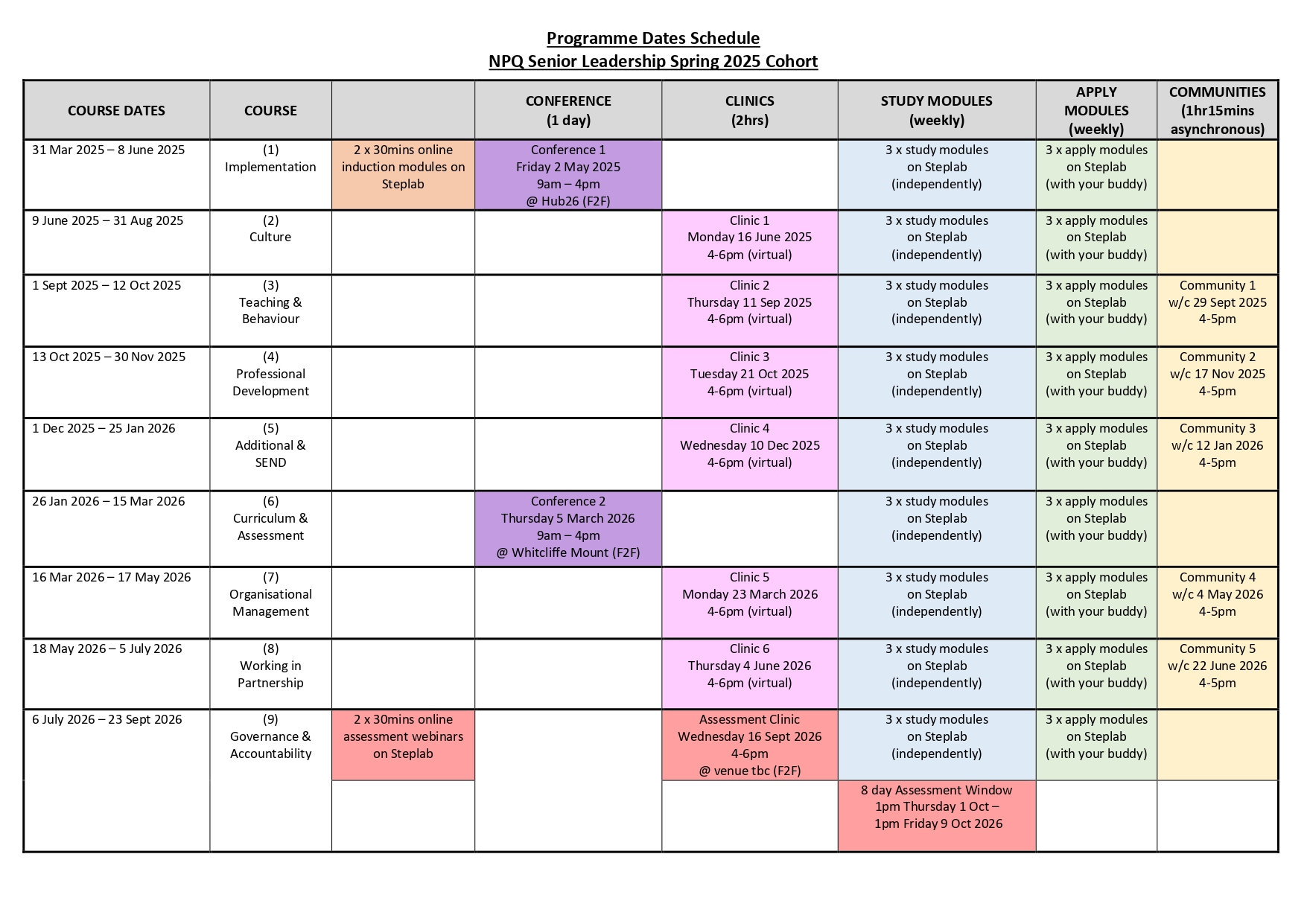 Times and dates for all events are noted in the 'programme dates schedule' below.