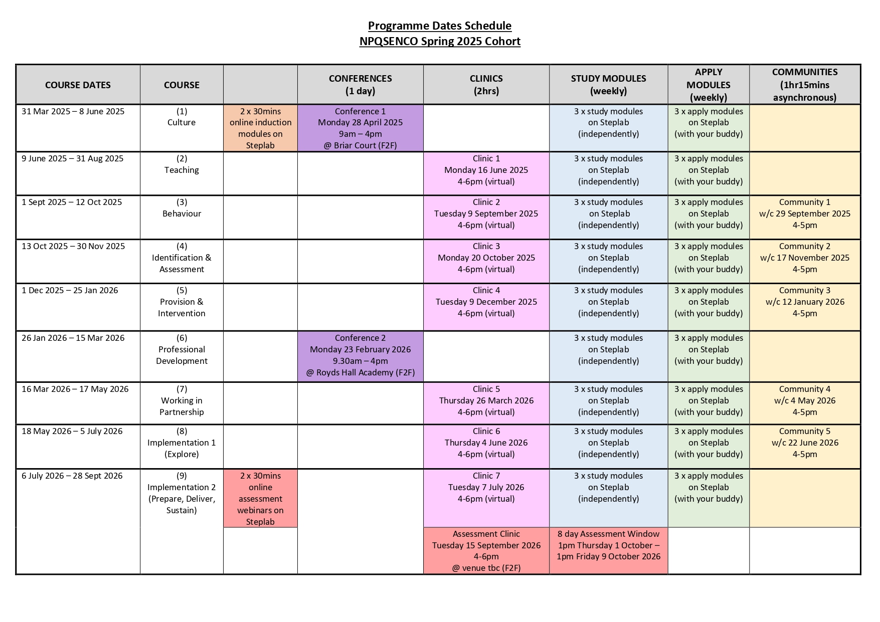 Times and dates for all events are noted in the 'programme dates schedule' below.
