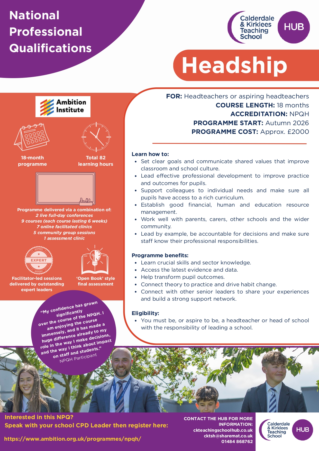 Click on the image opposite to download a copy of our programme guide or contact us for more information or guidance about this NPQ programme.